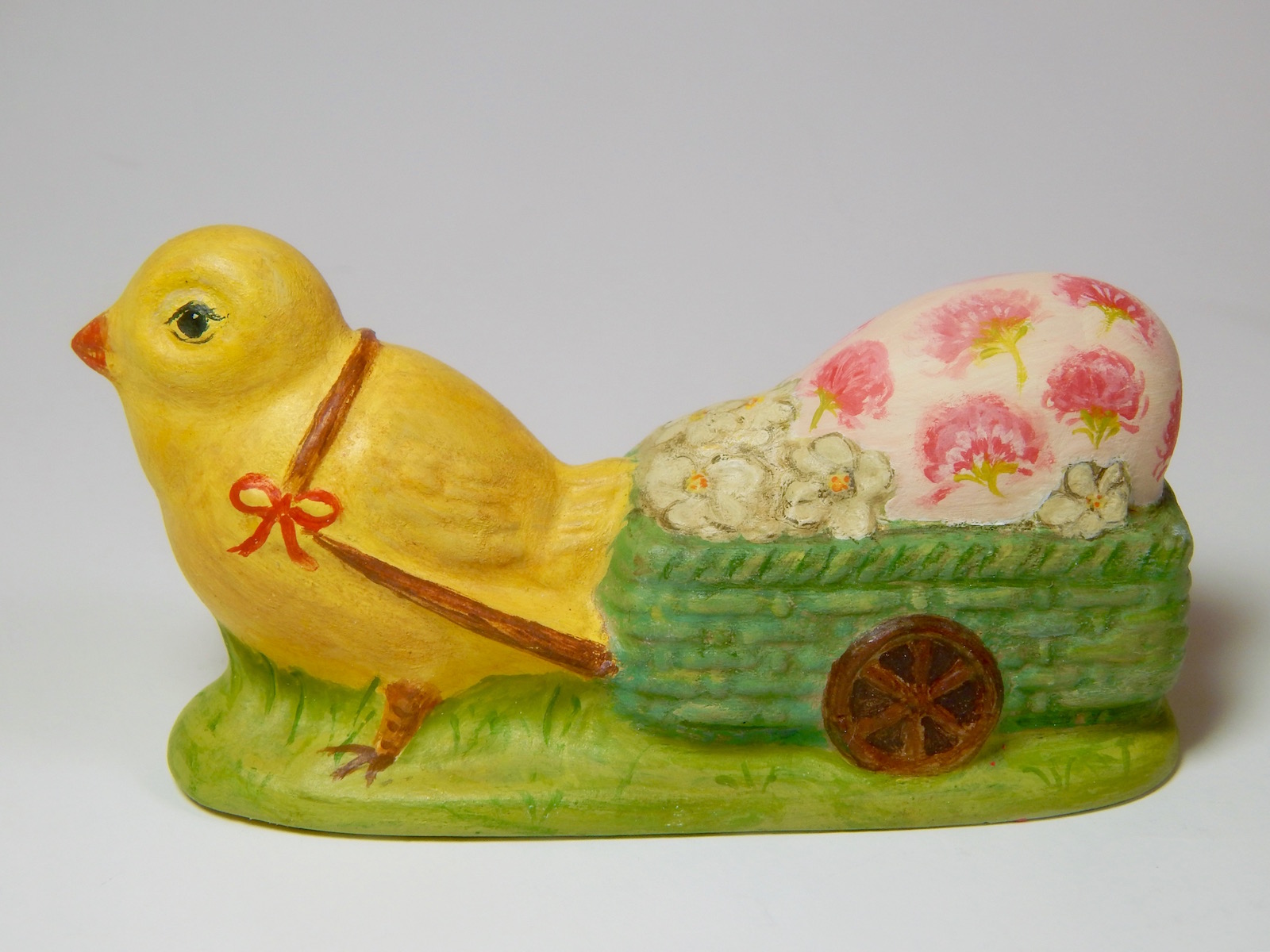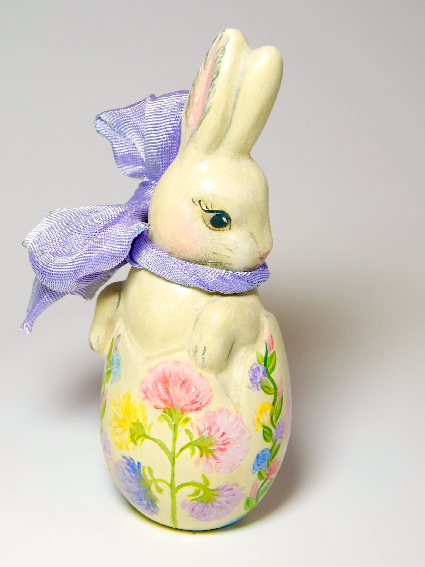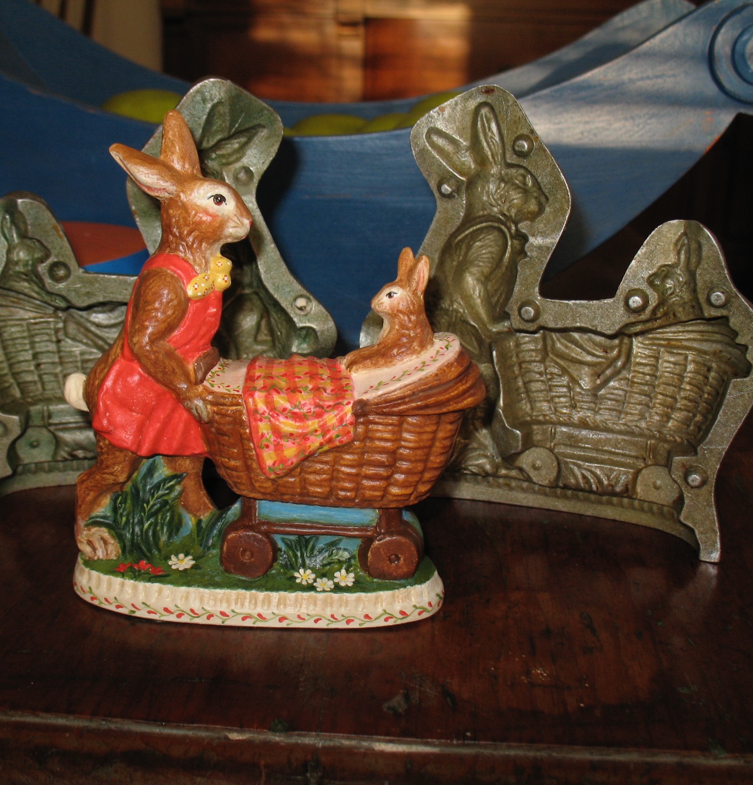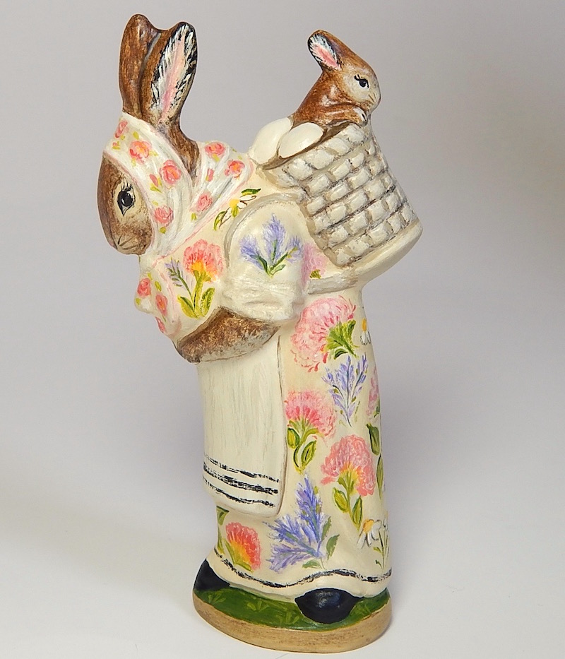 This collection features rare figures cast from antique Anton Reiche chocolate molds, ranging from classic sitting hares to whimsical scenes like a mother rabbit with her baby carriage. Each piece is meticulously detailed, often featuring my signature fleur-de-lis patterns or delicate pastel florals, hand-painted in rich, saturated colors that celebrate the coming of spring.