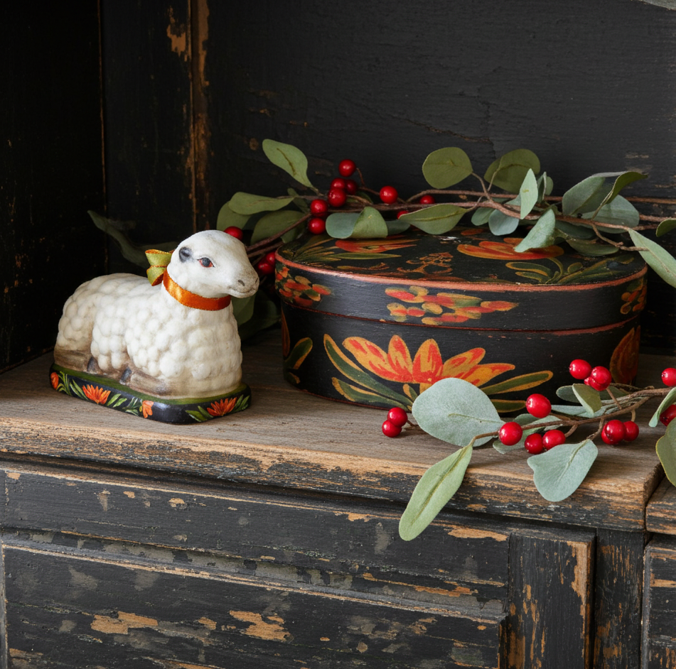 The intricate hand-painted design on the base is directly inspired by the traditional Pennsylvania Dutch floral patterns found on antique pantry boxes. This detail makes it an exceptional companion piece for a primitive or country collection.