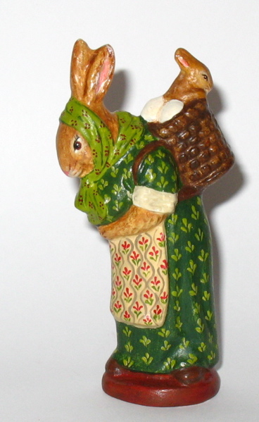 This 4-inch R224 chalkware mother rabbit, carrying her baby in a basket on her back, is a timeless piece designed for collectors of primitives and traditional folk art. Cast from an antique chocolate mold, the figure captures a quiet, maternal charm that transcends the Easter season.