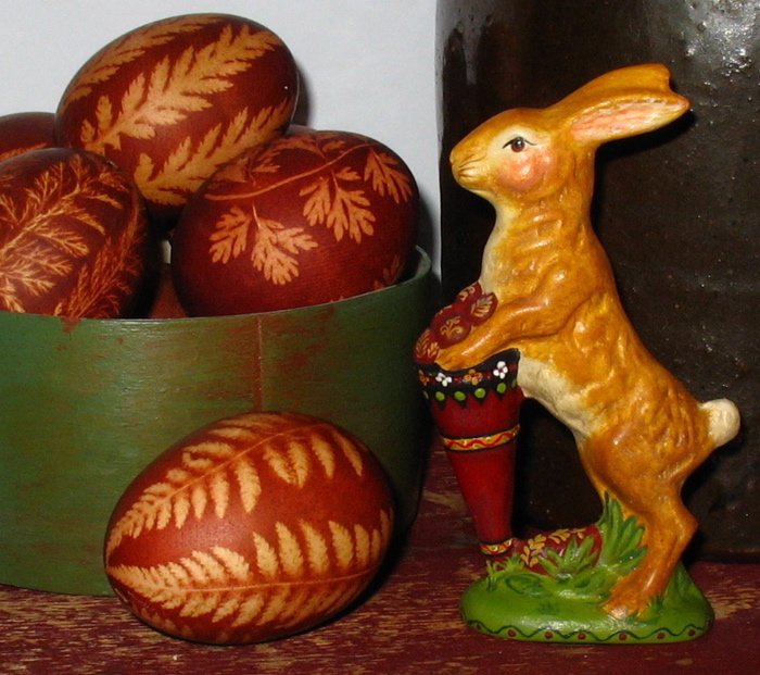 The rabbit carries a cone filled with "onion skin eggs," with one additional egg resting at its feet. The art of making onion skin eggs is a traditional German technique where eggs are dyed using the outer skins of onions to achieve a rich, earthy marbleized effect.
