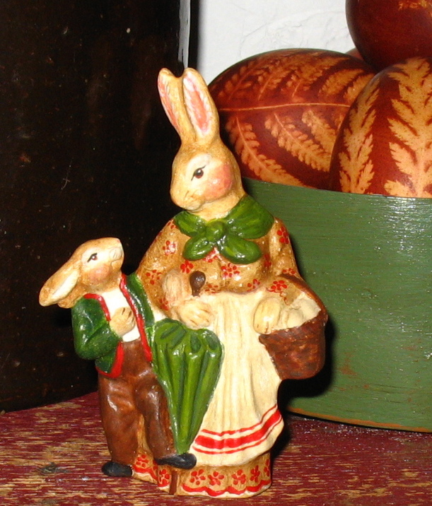 This hand-crafted "Masterwork in Miniature" features a Chalkware Mother Rabbit with her bunny son. It is cast from an exceptionally rare, tiny antique chocolate mold created by Anton Reiche of Dresden, Germany.