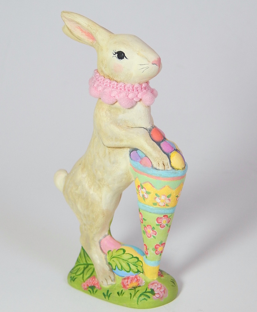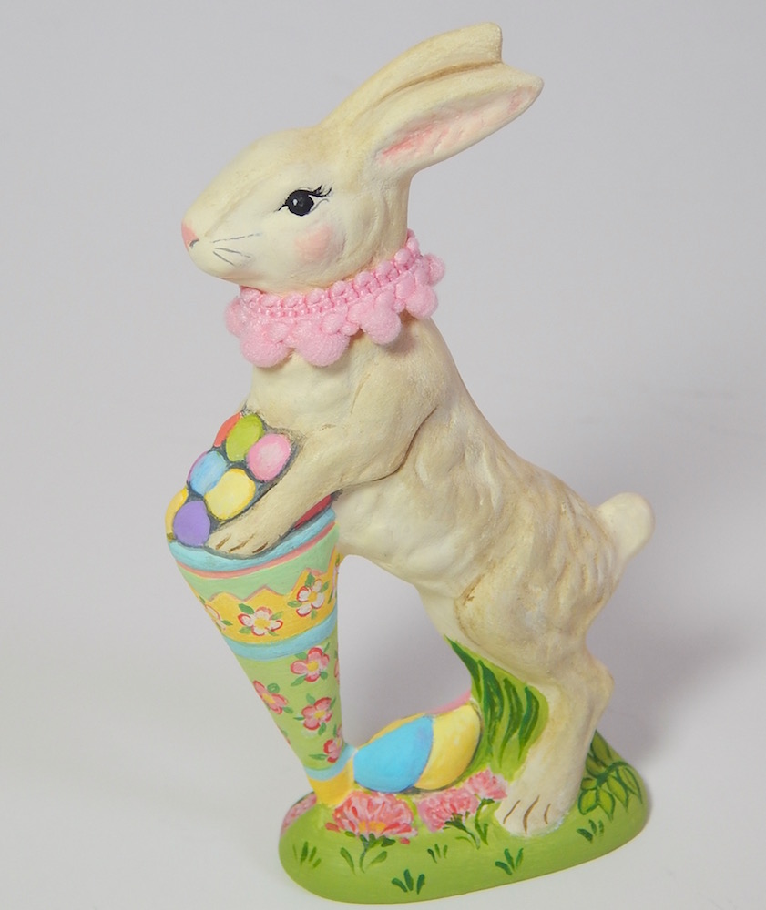 Hand crafted Bittersweet House Folk Art Rabbit in egg. The rabbit was created by molding chalkware into an antique German chocolate mold. The folk art chalkware Rabbit measures approx 5 inches, is signed, numbered and dated on the bottom. ![]() click image for enlarged view ![]() Using self-taught methods, Bittersweet House Folk Art captures the character and warmth of the German folk art tradition of chalkware and offers unique, hand crafted treasures. While some pieces are crafted using engaging innovative designs, others are inspired by the designs of centuries past. The exacting craftsmanship, colorful design, and finishing reflects our historic past and as a result, each piece takes on the feel of a well-loved antique. Finishing expertise and attention to eye-catching details ensure a treasure that will last a lifetime. |