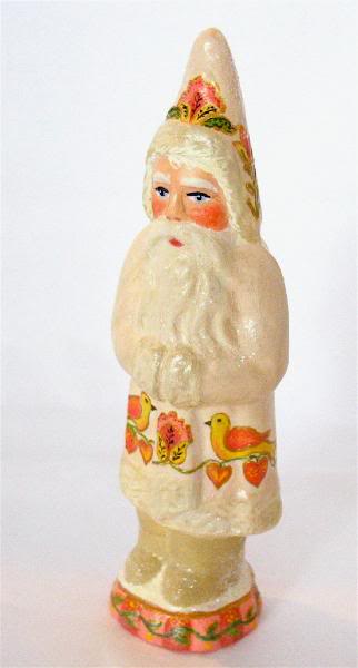 Of special note: Cast in chalkware using a wonderful rare antique German chocolate mold, measuring approx 5 inches tall. Santa's coat is hand painted with an antique folk art German design. The piece is numbered, dated and hand signed "Bittersweet House Folk Art, Kathryn Campbell".