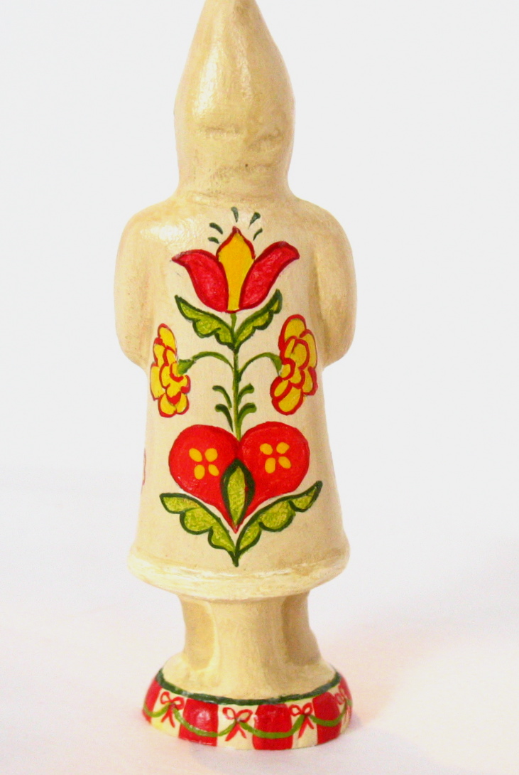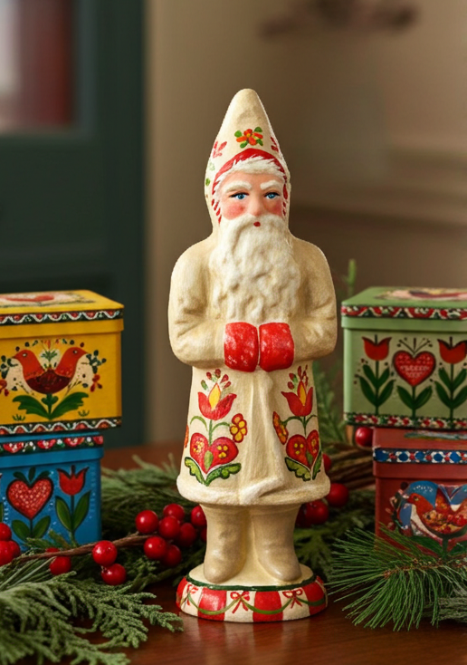 Standing 4 inches tall, the S561 Chalkware Christmas Santa is a vibrant tribute to 18th-century folk art Pennsylvania Fraktur. The piece feautres the bold palette of ochre, deep greens, and cinnabar reds that defined the Pennsylvania Dutch homesteads.
