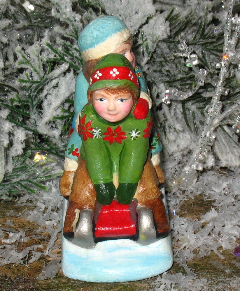 Snow day! The S581 captures the exhilaration of a winter afternoon spent racing downhill on a sled. Standing 5 inches tall, this chalkware masterwork departs from traditional vertical forms, featuring a distinctive slanted composition that conveys motion, momentum, and youthful delight.