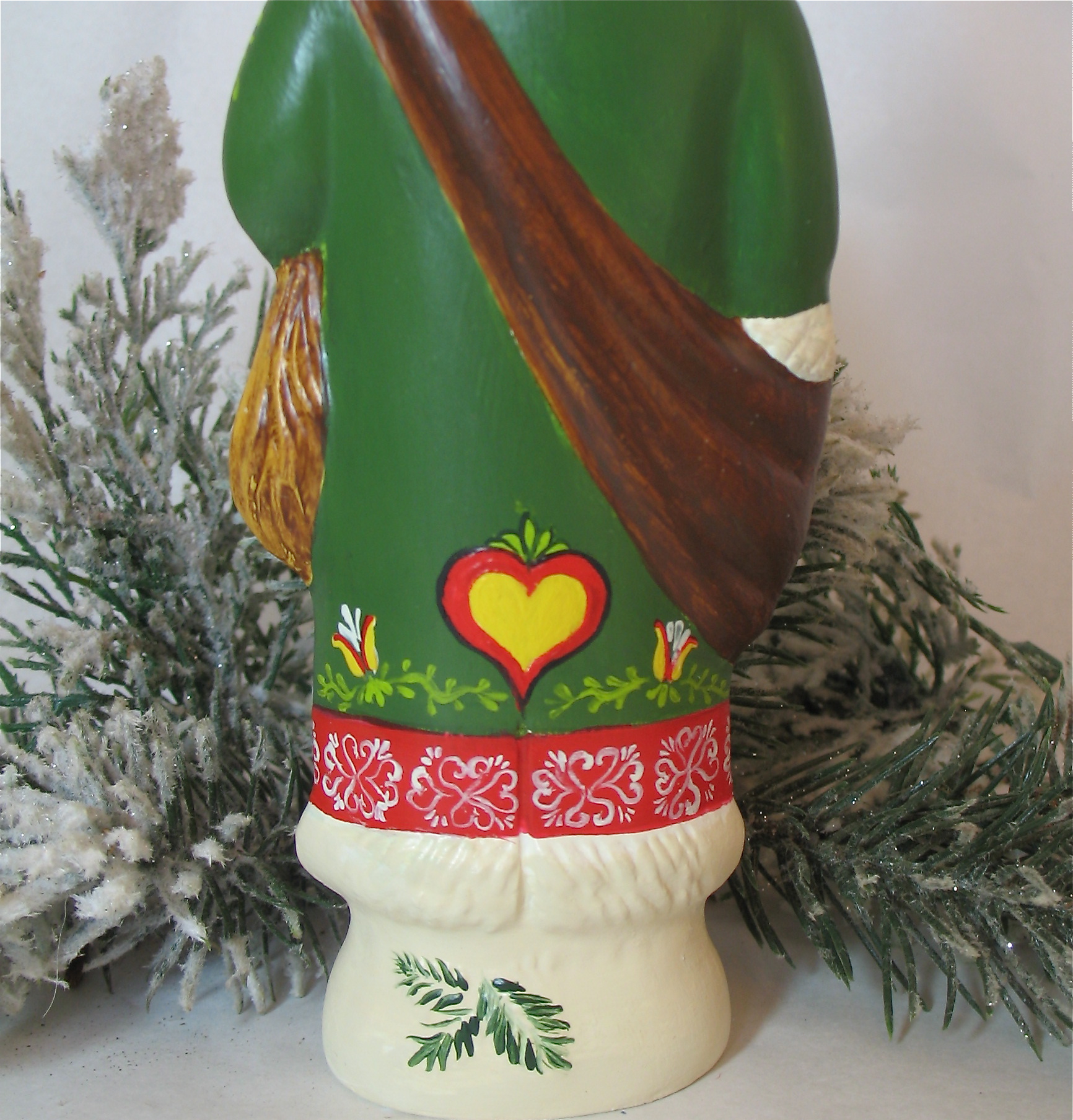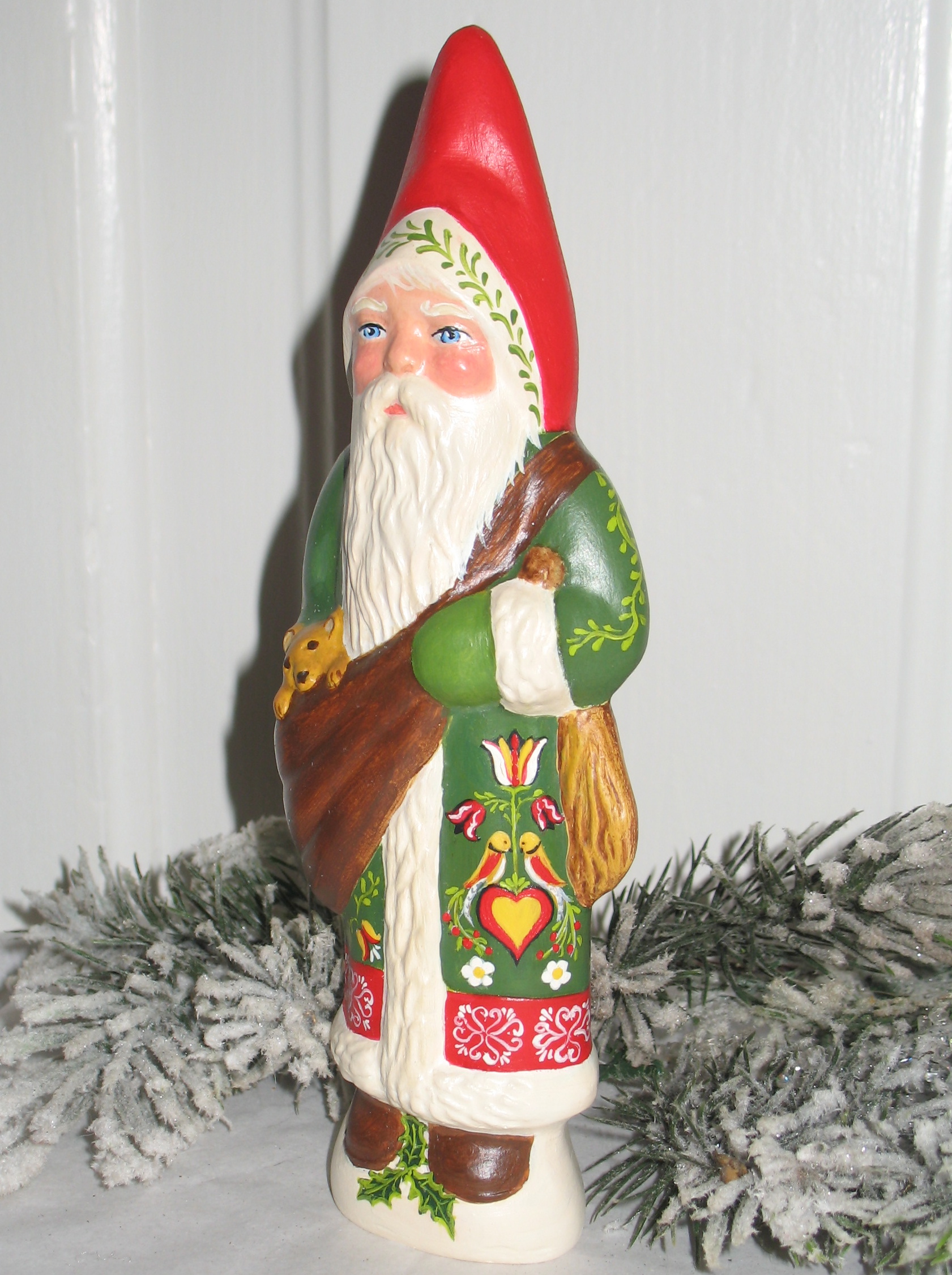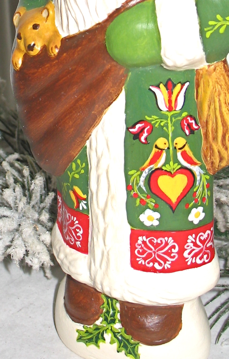Handcrafted by artist Kathryn Campbell, this Santa features an **intricate Pennsylvania Dutch Fraktur design.** The coat is a canvas for traditional motifs, including the **Distelfink** (the bird of good fortune), symmetrical hearts, and blooming floral vines.