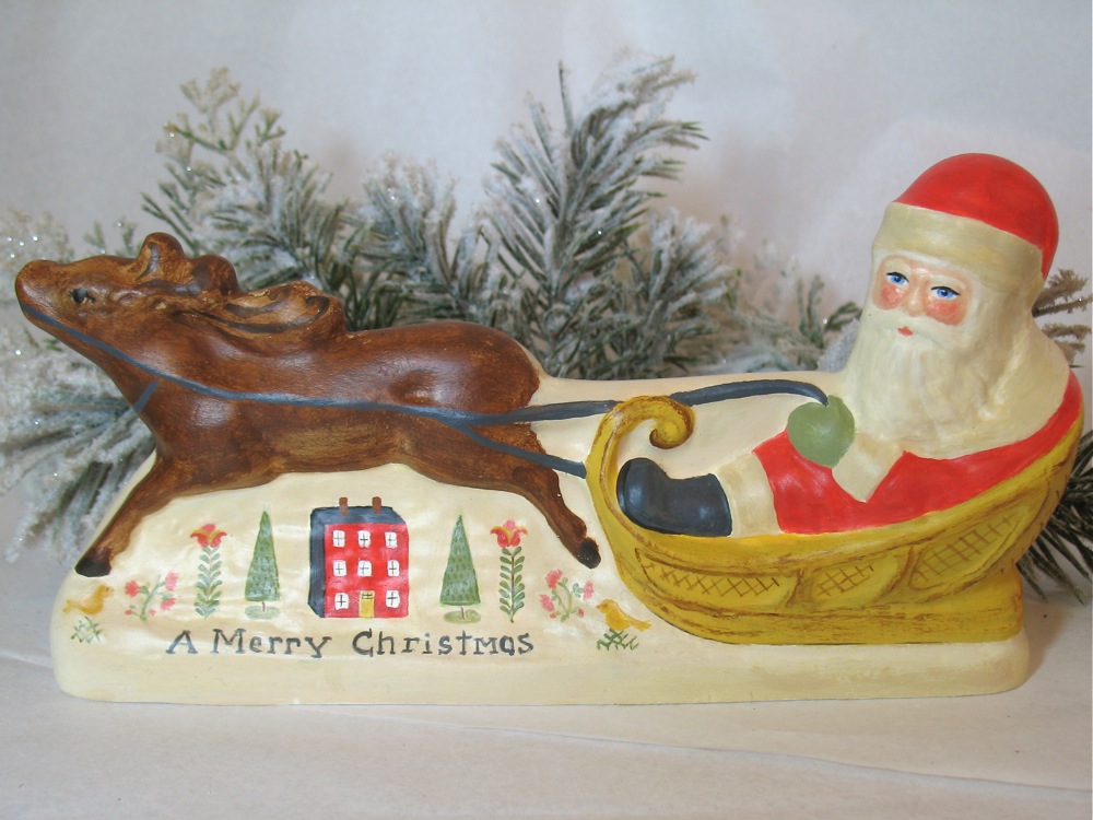 Handcrafted by artist Kathryn Campbell, this unique Belsnickle is **inspired by an 1831 sampler made by 13-year-old Catharine Ringwall.** The intricate, cross-stitch style motifs are hand-painted onto a figure cast from a **rare antique chocolate mold manufactured by Jaburg of New York.**