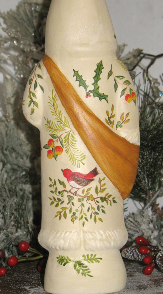 A warm welcome. The S653 is an 8.5-inch Colonial chalkware Santa hand-cast from an antique chocolate mold, then hand-painted in a soft parchment palette with winterberries and botanical songbirds tucked among evergreen boughs. The overall effect is collected and quietly festive—an Early American mood in holiday form.