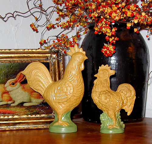 Large Chalkware Yelloware Rooster with green glaze; 7 1/2 inches x 5 1/2 inches; $38